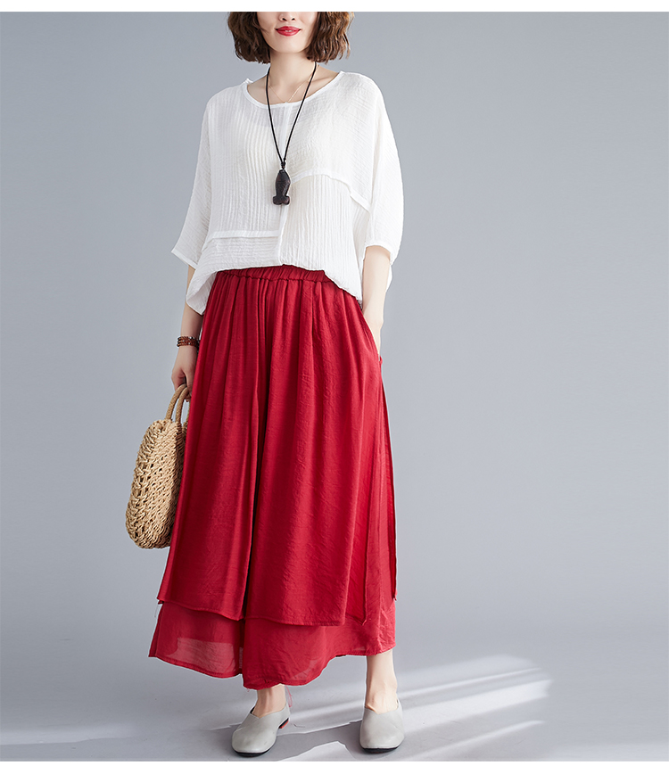 文学的な女性の夏の綿麻ワイドパンツ 無地9分丈ワイドパンツ